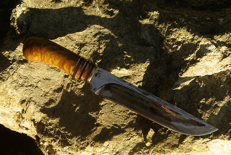 Charza Velká • čepel 21,2 cm : 4 cm (8,48" : 1,6 ") 9-vrstvý sendvič • střenka 12,5 cm : 3,5 cm (5" : 1,4 ") oliva, proložená železným dřevem a mědí
